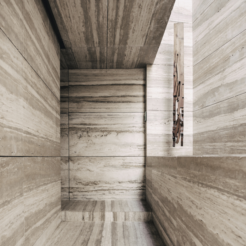 En la planta baja, la recepción se convierte en un espacio visual que proyecta videos de las canteras de ARCA, mostrando los orígenes de las piedras, sus procesos de extracción y otros aspectos inspiradores en la creación de materiales.