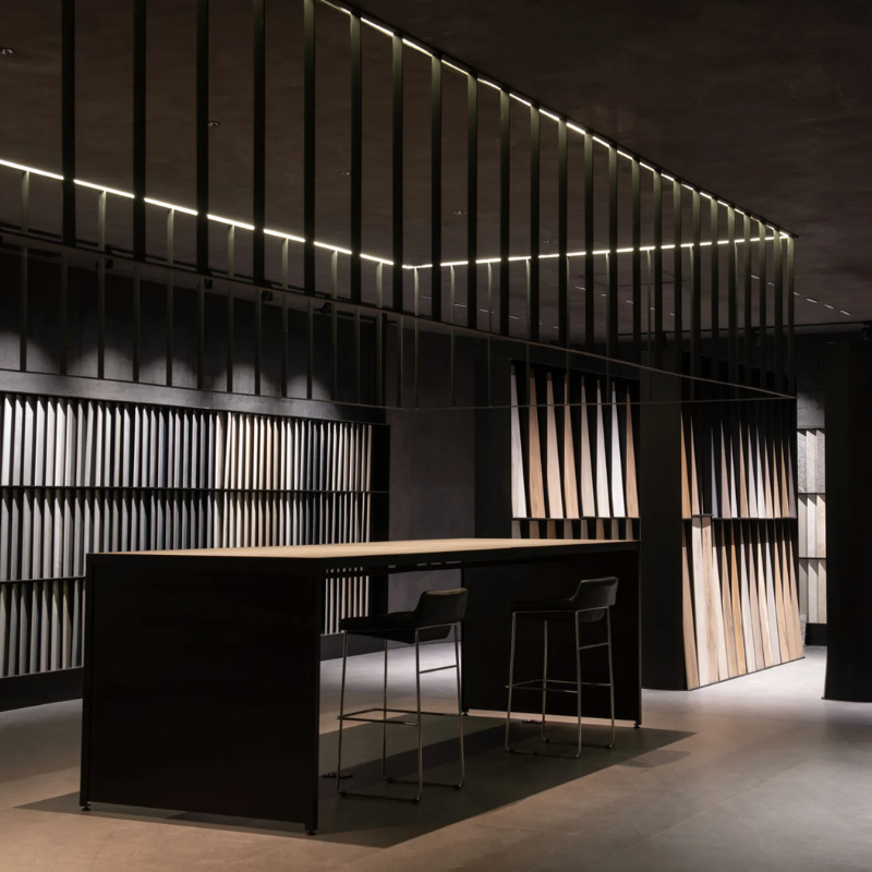 El segundo piso del Design Center ofrece una fascinante exposición que recorre la evolución de los materiales, desde la madera natural hasta la cerámica, los mosaicos y la porcelana. Cada sala está dedicada a un material en particular, permitiendo que los arquitectos y diseñadores exploren sus texturas, colores y aplicaciones.