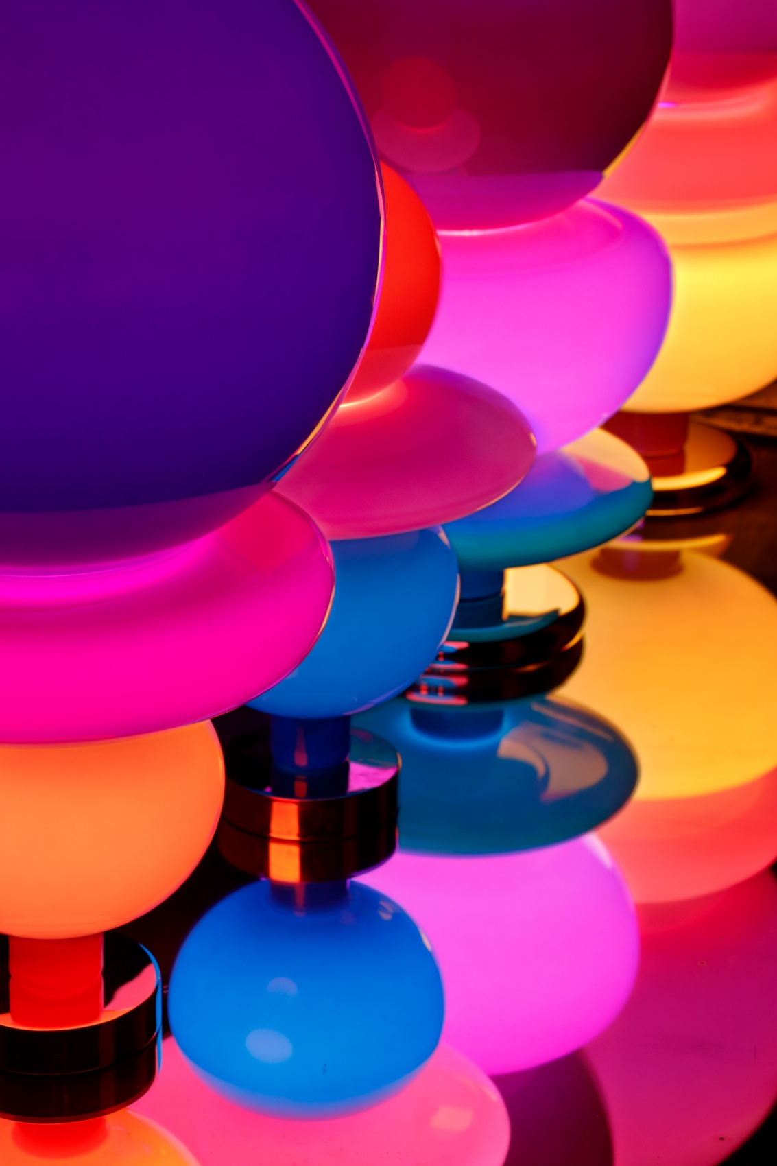 Las esculturas cambian de aspecto según la hora del día. Durante el día, reflejan los rayos solares, creando composiciones únicas. Por la noche, incluso con una simple bombilla blanca, proyectan un degradado de arco iris que envuelve el entorno en una atmósfera cálida y acogedora.