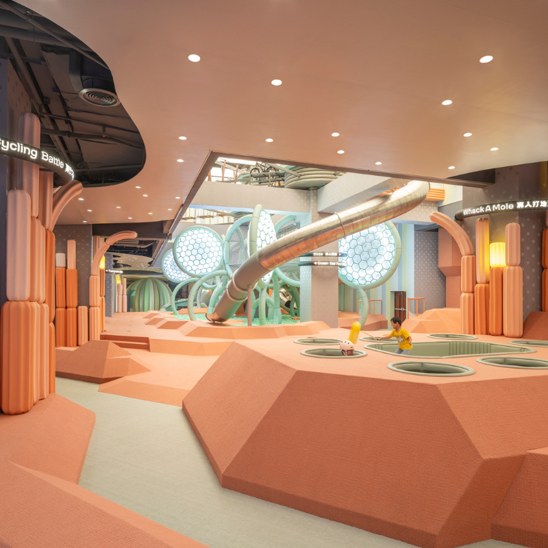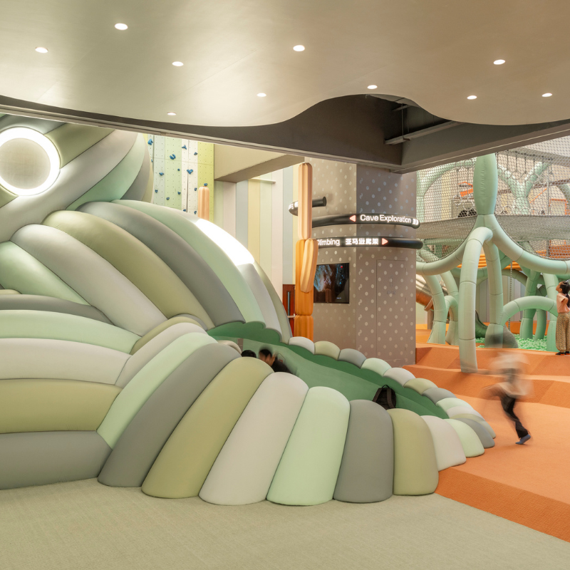 El suelo, diseñado como un paisaje topográfico de dunas artificiales, combina bloques trapezoidales modulares que estimulan la coordinación y el equilibrio, haciendo del terreno un campo de entrenamiento natural.