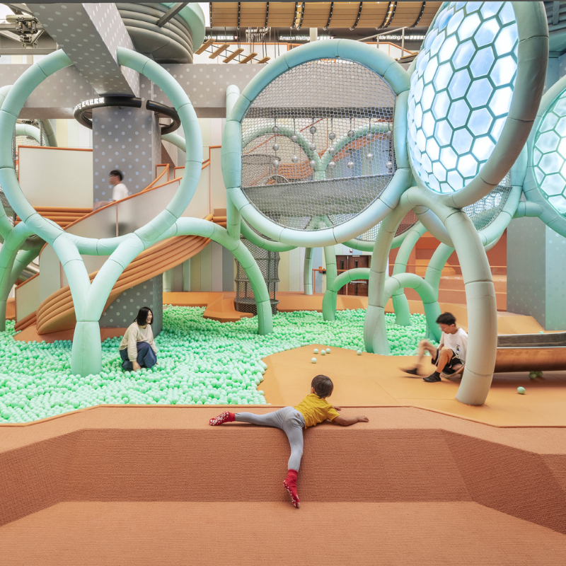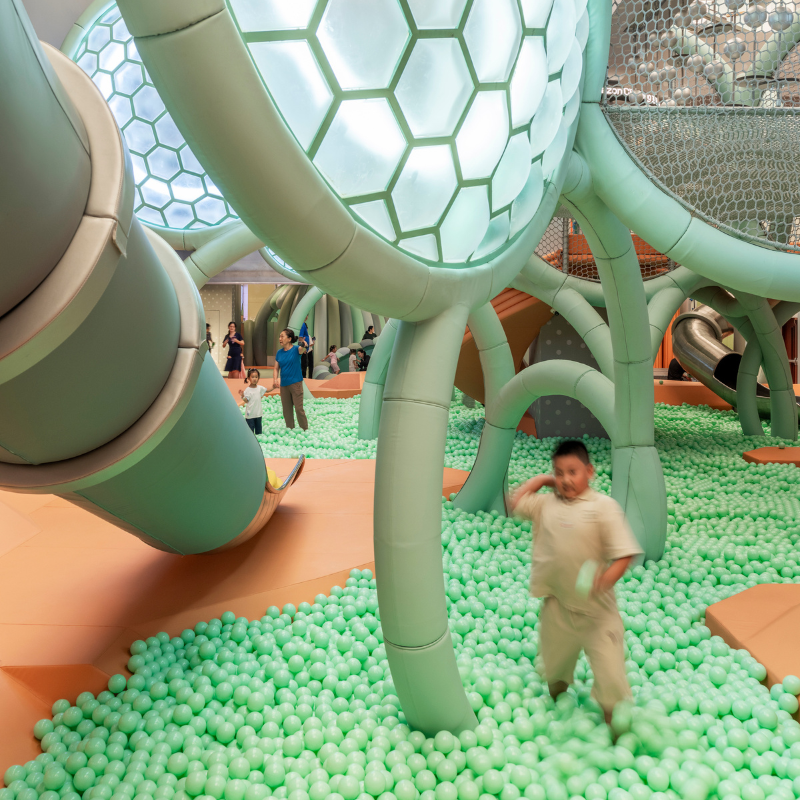 Cactus Barril: siete esferas interconectadas conforman una red tridimensional para trepar, deslizarse o gatear. Su interior se convierte en un territorio de exploración suspendida.