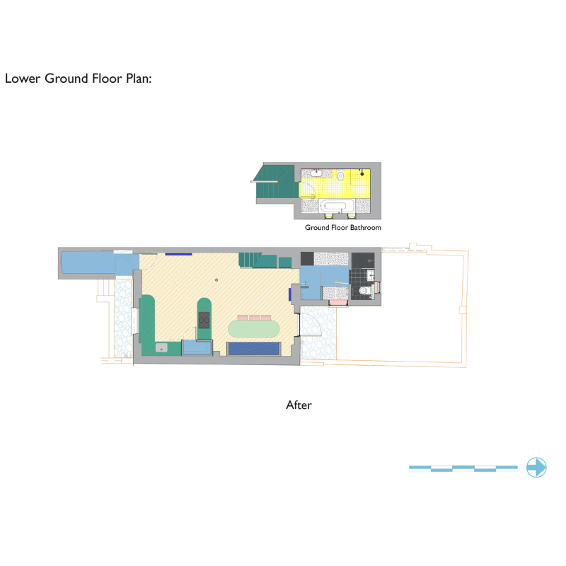 El diseño convirtió la planta baja, anteriormente húmeda, oscura y fragmentada, en un espacio abierto que integra cocina, comedor y áreas de convivencia. Se eliminaron paredes internas de baños y zonas de servicio para maximizar la amplitud, mientras que los muebles diseñados a medida, acompañados de una paleta de colores tropicales, espejos e iluminación estratégica, aportan un carácter único al hogar.