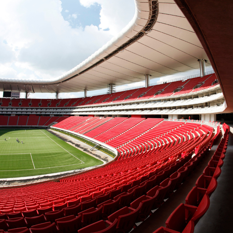 Uno de los aspectos más innovadores fue la decisión de eliminar las barreras físicas tradicionales. Rejas y muros desaparecieron para dar lugar a una continuidad espacial inédita en estadios de futbol, donde la fluidez y la transparencia refuerzan el sentido de comunidad. La única entrada principal unifica la experiencia del aficionado, creando un acceso igualitario que desemboca en un circuito comercial que rodea y jerarquiza la verdadera protagonista: la cancha.