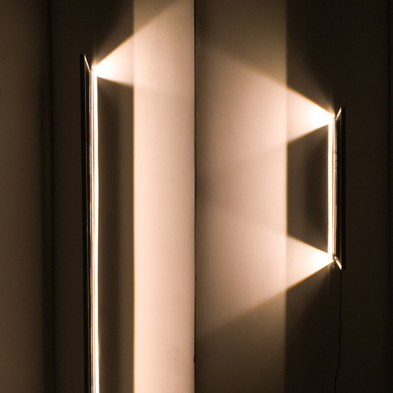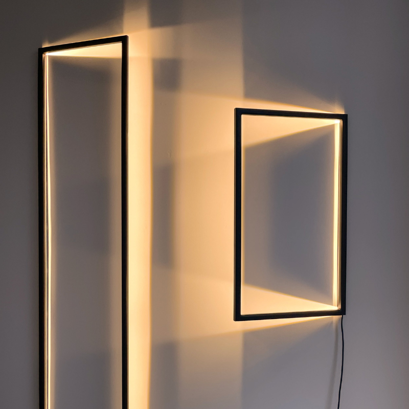 Maya es una serie de esculturas de luz concebidas como marcos vacíos que transforman las paredes al proyectar luz de una manera envolvente, generando una experiencia visual y sensorial única. Estas piezas no solo iluminan; interactúan con el usuario, ofreciendo una respuesta lumínica que sigue sus movimientos. Este juego con la luz trae una nueva dimensión a la pared, que de otro modo sería plana, evocando una ilusión de profundidad que captura la atención.
