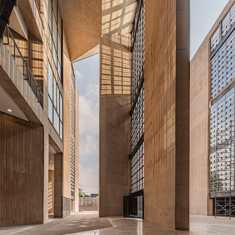Materialmente, el museo se expresa con concreto armado aparente, trabajado con texturas que aportan calidez y escala humana. La estructura es también piel y lenguaje arquitectónico, un bosque abstracto de muros que dan identidad al recinto y cercanía al usuario.