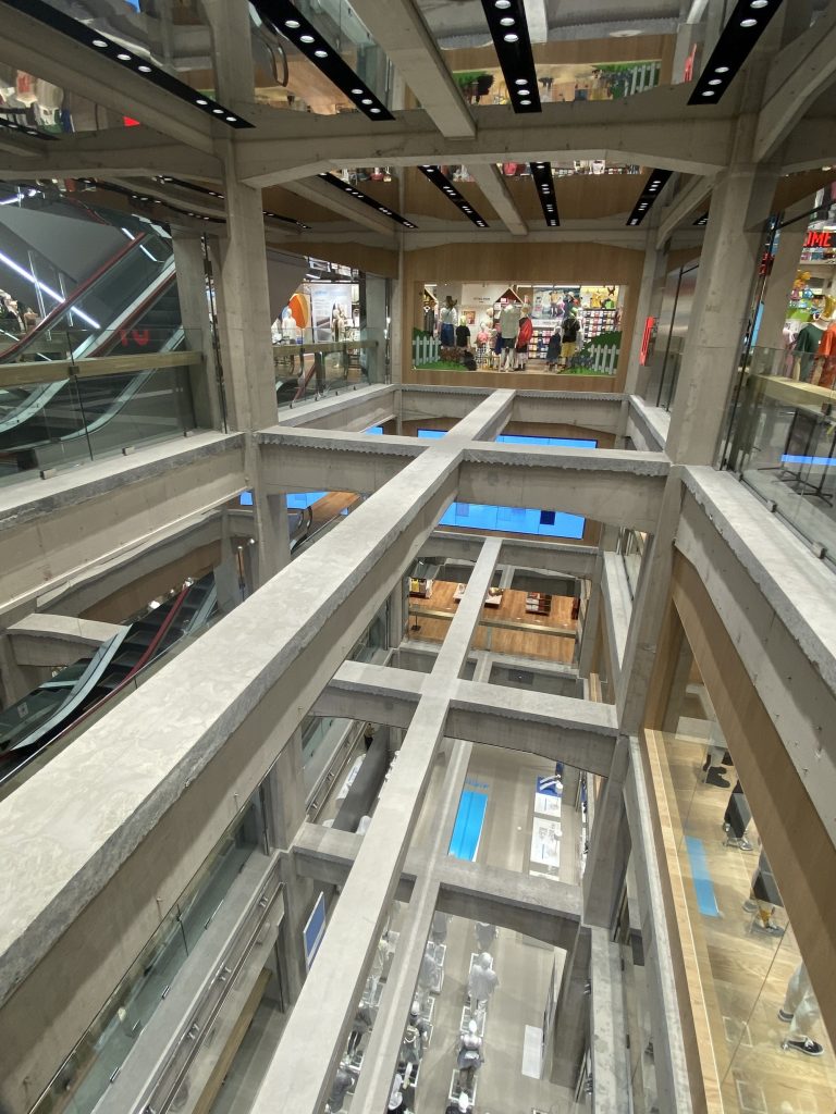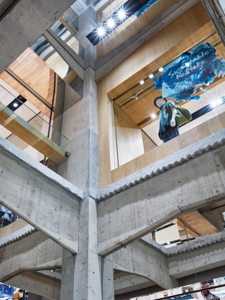 El diseño combina la crudeza del hormigón con materiales contemporáneos como madera, metal y vidrio. Los espejos y paneles de colores amplifican la percepción espacial, mientras que la malla ortogonal de la estructura original organiza el espacio de manera ordenada y funcional. Estas decisiones aportan un ambiente moderno y acogedor, ideal para una experiencia de compra innovadora.