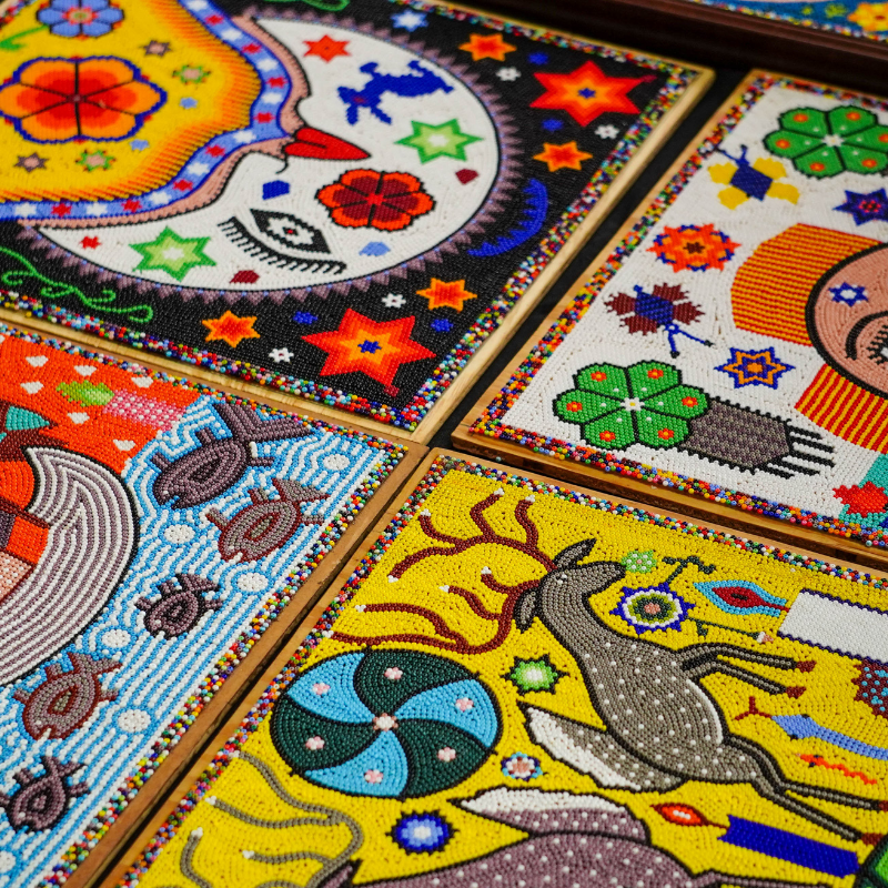Cada obra de Santos es fruto de una labor compartida. Su familia participa en el proceso creativo, desde el dibujo inicial hasta la colocación paciente de las chaquiras que dan forma y brillo a los murales. Esa colaboración convierte las piezas en testimonios colectivos, no solo de un artista, sino de toda una tradición viva.
