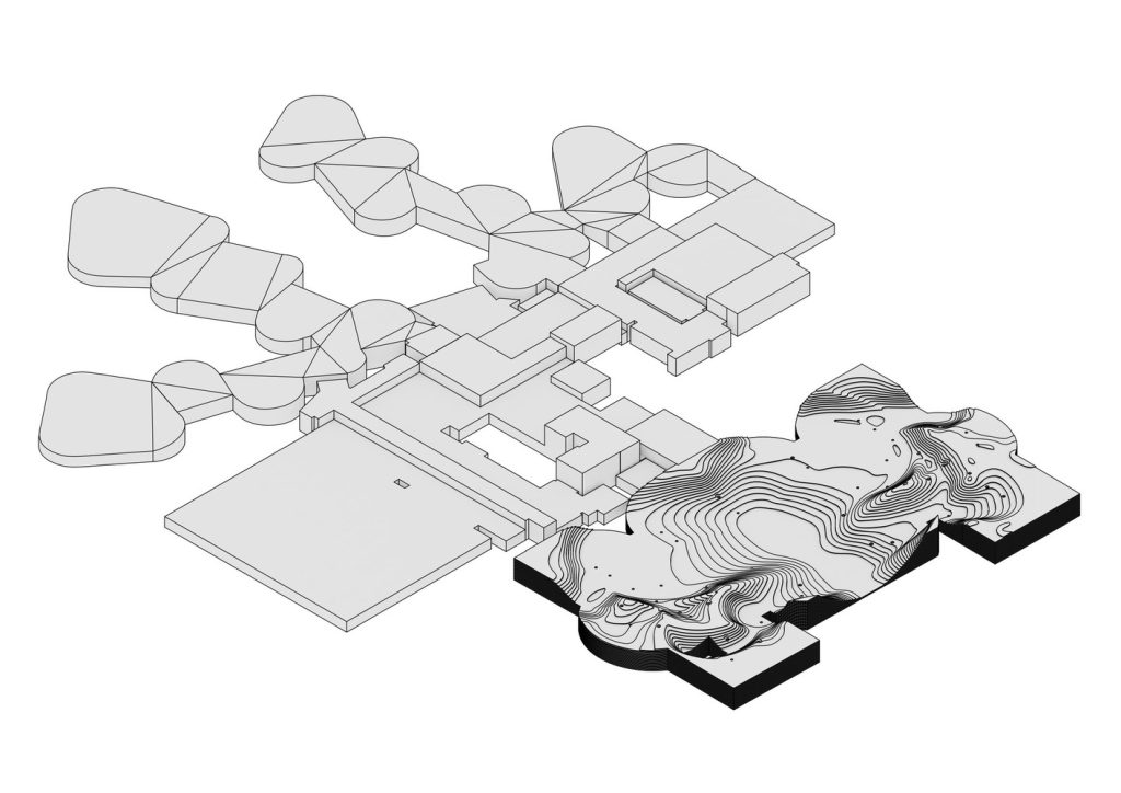 Los pabellones se extienden hasta patios en el mismo nivel, los cuales se conectan con el parque mediante gradas que cumplen un doble propósito: generar un límite sutil y, al mismo tiempo, integrar el espacio exterior al restaurante. Además, el techo alberga un jardín de hierbas, reforzando la identidad gastronómica del lugar con ingredientes de producción propia.