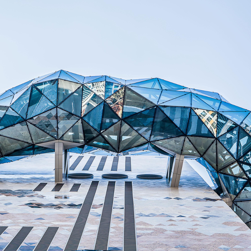 El contraste surge con el llamado “bucle público”, una ruta en espiral envuelta en una fachada multifacética de vidrio que atraviesa el volumen pétreo. Esta secuencia de terrazas en cascada ofrece espacios para exposiciones, espectáculos y encuentros culturales, al tiempo que conecta la vida urbana con la interioridad del edificio. Desde afuera, la transparencia revela las dinámicas comerciales y sociales; desde adentro, los visitantes disfrutan de nuevos puntos de vista para experimentar la ciudad.